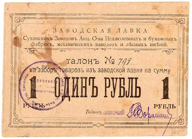 Талон на 1 рубль, заводская лавка Сухонских заводов, Вологда.