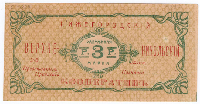 Разменная марка в 3 рубля, Верхне-Никольский кооператив, Нижний Новгород.