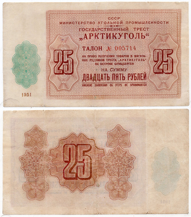Талон в 25 рублей, 1951 год, Арктикуголь.