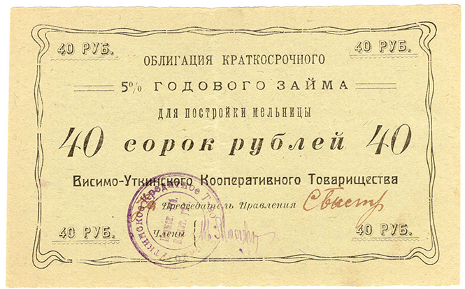 Облигация в 40 рублей, 1922 год, Кооперативное товарищество по постройке мельницы, Висимо-Уткинск.