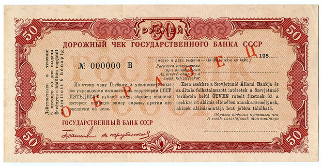 Дорожный чек 50 рублей ГБ СССР Образец 1950х
