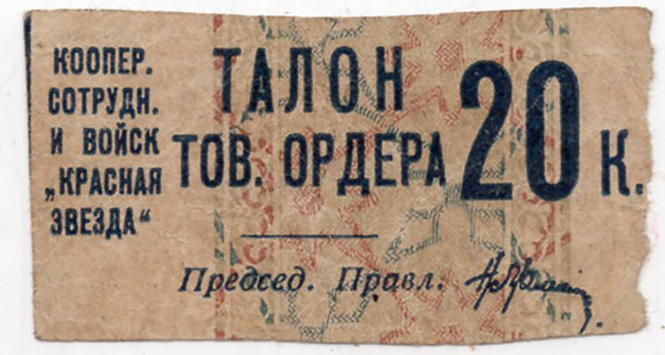 Талон к товарному ордеру в 20 копеек, 1931 год, кооператив сотрудников и войск "Красная звезда".
