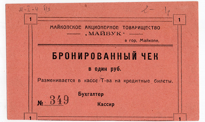 Бронированный чек в 1 рубль, Акционерное товарищество "Майбук", Майкоп.