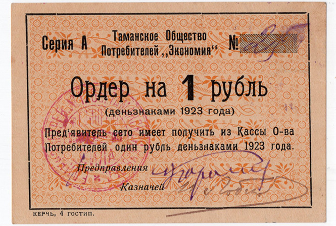 Ордер на 1 рубль, 1923 год, Потребительское Общество "Экономия", Тамань.