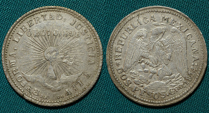 2 песо 1914 год, Ag+Au, Герреро, Мексика.