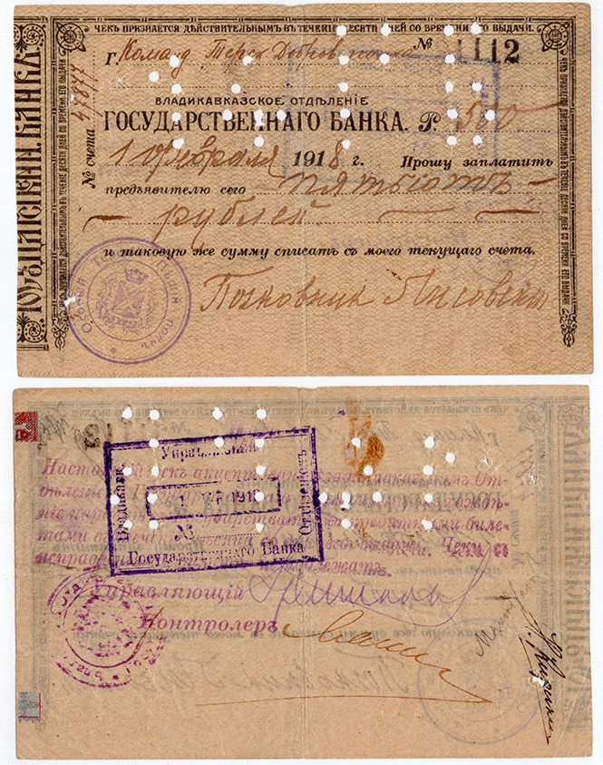 Чек в 500 рублей 1918 год, Владикавказское отделение ГБ, Особый Терский Пеший полк.