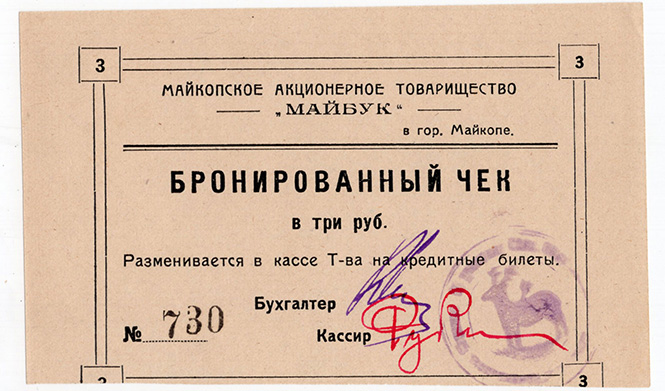 Бронированный чек в 3 рубля, Акционерное товарищество "Майбук", Майкоп.