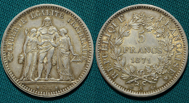 5 франков 1871 год, Ag, 900 пробы 25 грамм, А, Франция.