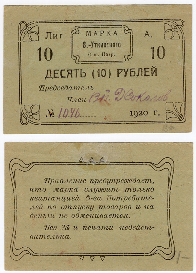 Марка в 10 рублей, 1920 год, Висимо-Уткинское Потребительское Общество.