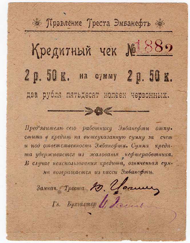Кредитный чек на 2,5 червонных рубля, 1923 год, Эмбанефть, Гурьев.