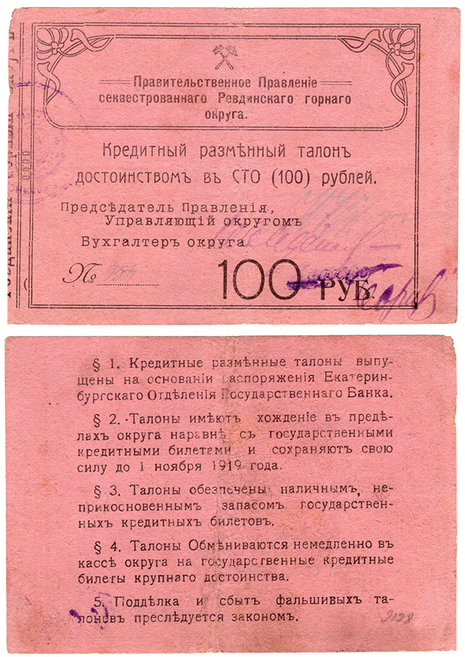 Кредитный разменный талон в 100 рублей, 1918 год, Горный округ, Ревда.