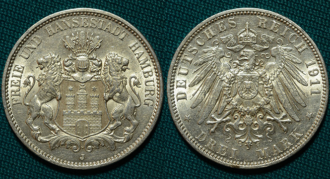 3 марки 1911 J Гамбург Германия