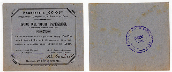 1000 рублей 1922 Кооператив Союз Ростов на Дону