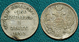 15 копеек/1 злотый 1840 год, Ag, 868 пробы 3,11 грамм, НГ, Польша.