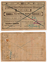 Расчетная марка в 1000 рублей, 1922 год, "Горсоюз", Владикавказ.