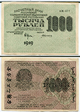 Расчетный знак в 1000 рублей, 1919 год, в/з "1000".