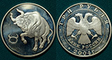 3 рубля 2004 год, Ag, 900 пробы 31,1 грамм, Телец.