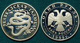 1 рубль 1999 год, Ag, 900 пробы 15,55 грамм, СПМД, "Кавказская гадюка".